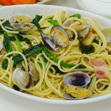 フライパンにオリーブオイルとたかの爪を熱し、ベーコンを焼く。茹でたスパゲティとB、あさりを加える。 |