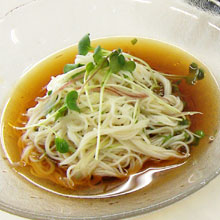 そうめんは沸騰した湯で茹でて、水洗いをし水気をきる。 |